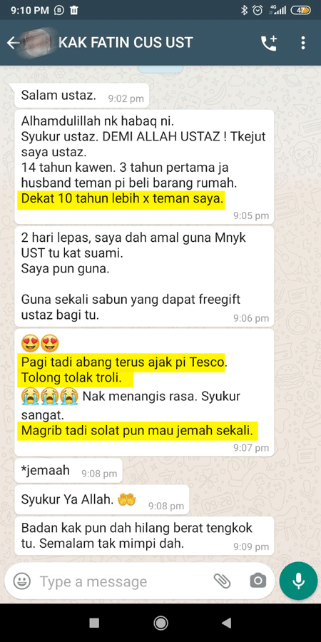 Lepas guna UST OIL Ustaz Abdullah ni, banyak sangat perubahan dalam hidup. Berniaga makin lancar, hubungan suami isteri dah tak macam dulu-dulu. Abg haji pun sampai ajak pi umrah sama-sama. Syukur sangat. Kak Shuria memang rekemen.