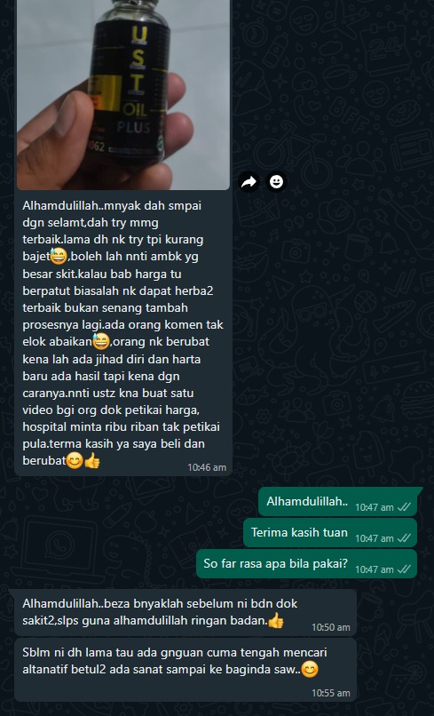 Alhamdulillah, lepas amalkan UST OIL, derita sihir makin pulih, sakit sendi saraf pun dah hilang!